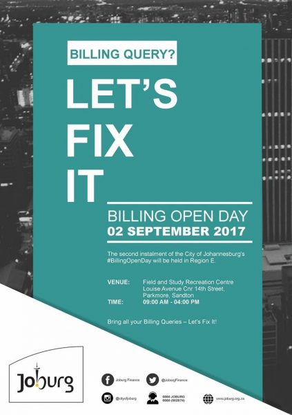 The second installment of the City of Johannesburg’s #BillingOpenDay will be held in Region E. Venue: Field & Study Recreation Centre Louise Avenue Cnr 14th Street Parkmore, Sandton Time: 09h00 – 16h00 Bring all your billing queries – Let’s Fix It!
