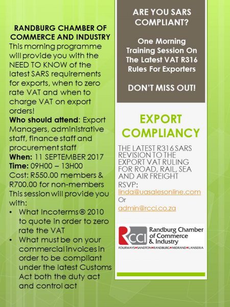 EXPORT COMPLIANCY THE LATEST R316 SARS REVISION TO THE EXPORT VAT RULING FOR ROAD, RAIL, SEA AND AIR FREIGHT RANDBURG CHAMBER OF COMMERCE AND INDUSTRY This morning programme will provide you with the NEED TO KNOW of the latest SARS requirements for exports, when to zero rate VAT and when to charge VAT on…