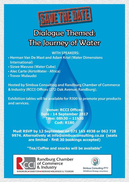 Dialogue Themed: The Journey Of Water 14 September 2017 RSVP by 12th September on 071 165 4938 or 062 728 9974 or by email to [email protected]