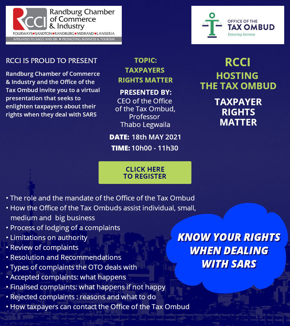 Randburg Chamber of Commerce & Industry and the Office of the Tax Ombud invite you to a virtual presentation that seeks to enlighten taxpayers about their rights when they deal with SARS.