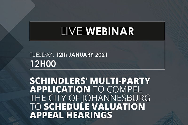 Schindlers Attorneys and LexU: Multi-Party Application to Compel the City of Johannesburg to Schedule Valuation Appeal Hearings Description: A discussion relating to Schindlers' Multi-Party Application to Compel the City of Johannesburg to Schedule Valuation Appeal Hearings. Time: Jan 12, 2021 12:00 PM CAT